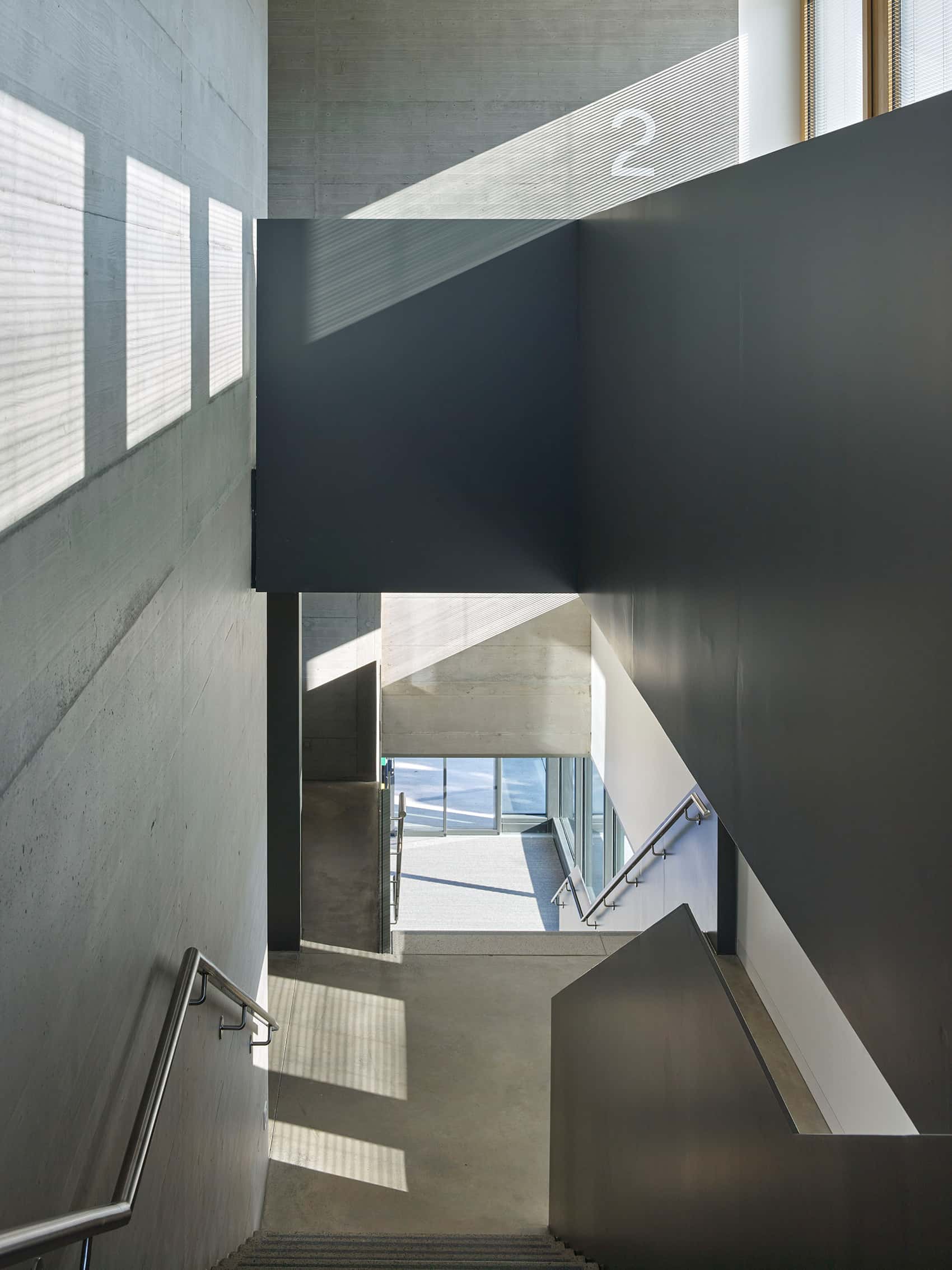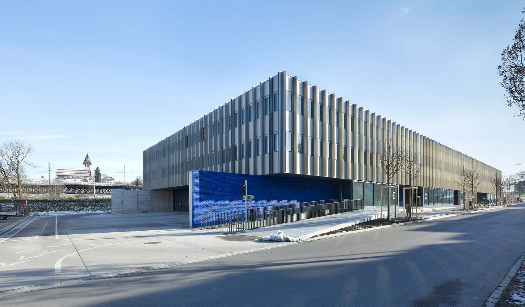 Die Nutzungsüberlagerungen und die notwendigen Auskragungen geben das konstruktive Konzept und die Materialisierung des Gebäudes in Beton vor. Die Fassaden zeigen mit den blauen, weit in die Vorplätze ausgreifenden Wänden die Horizontalität der Busbewegungen und mit den vertikalen Lisenen die repetitive Aneinanderreihung der Schulnutzungen.