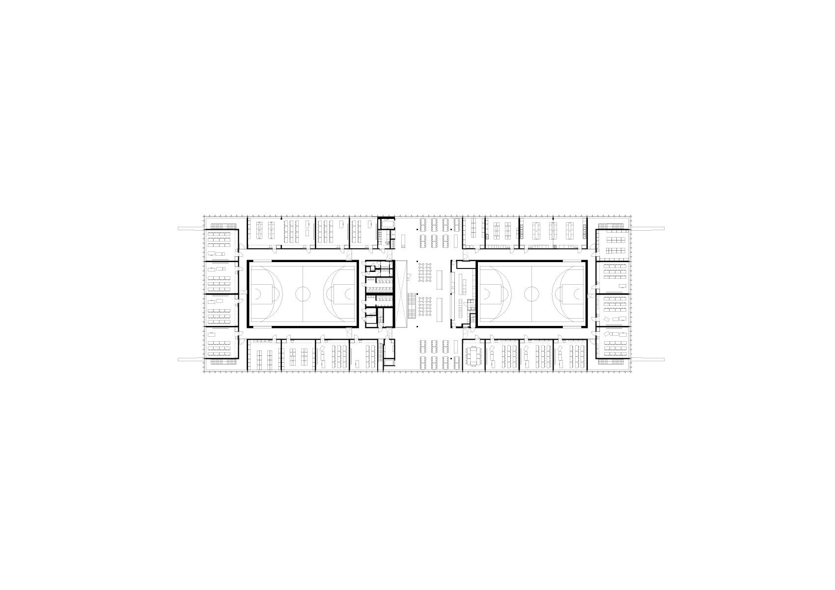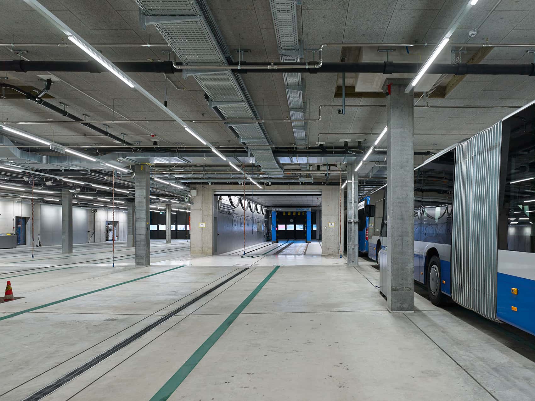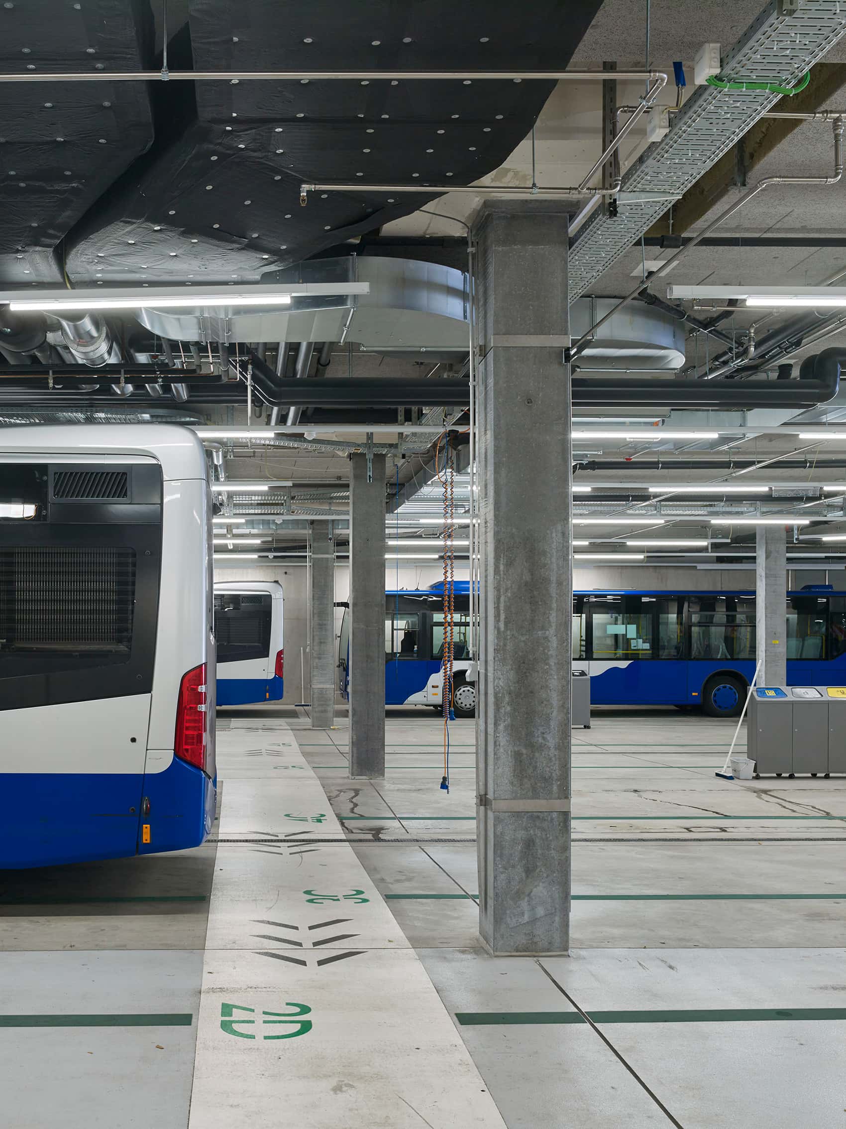 Die erste Entwurfsmassnahme war, dem Busdepot einen eigenen Ausdruck zu geben und es nicht im Untergeschoss zu versenken. Die ebenerdige Lage ermöglicht einfache und übersichtliche Bewegungen, kurze Wege, einen Aufenthaltsbereich für das Personal am Licht, ein optimiertes Gebäudevolumen und damit geringere Kosten. Die zentrale Lage des Busdepots verlegt die Erschliessungen an die Peripherie und gibt, zusammmen mit der beträchtichen Breite, das Layout der darüber liegenden Schule vor. Die Mitte der Schulanlage wird mit von oben belichteten Turnhallen genutzt, die peripheren Erschliessungen führen die Nutzer zum Licht und machen in den Pausen den Schulbetrieb sichtbar.
