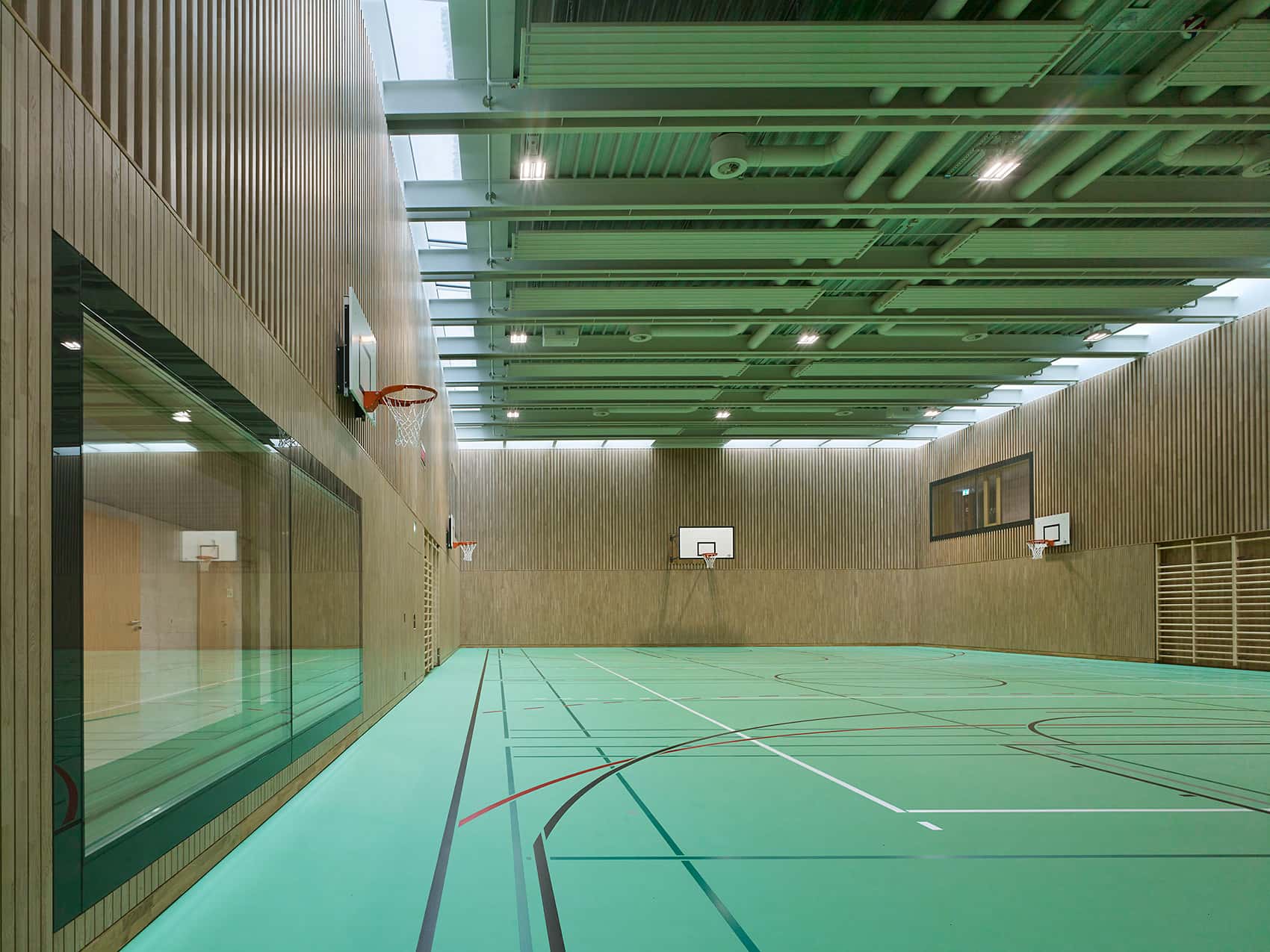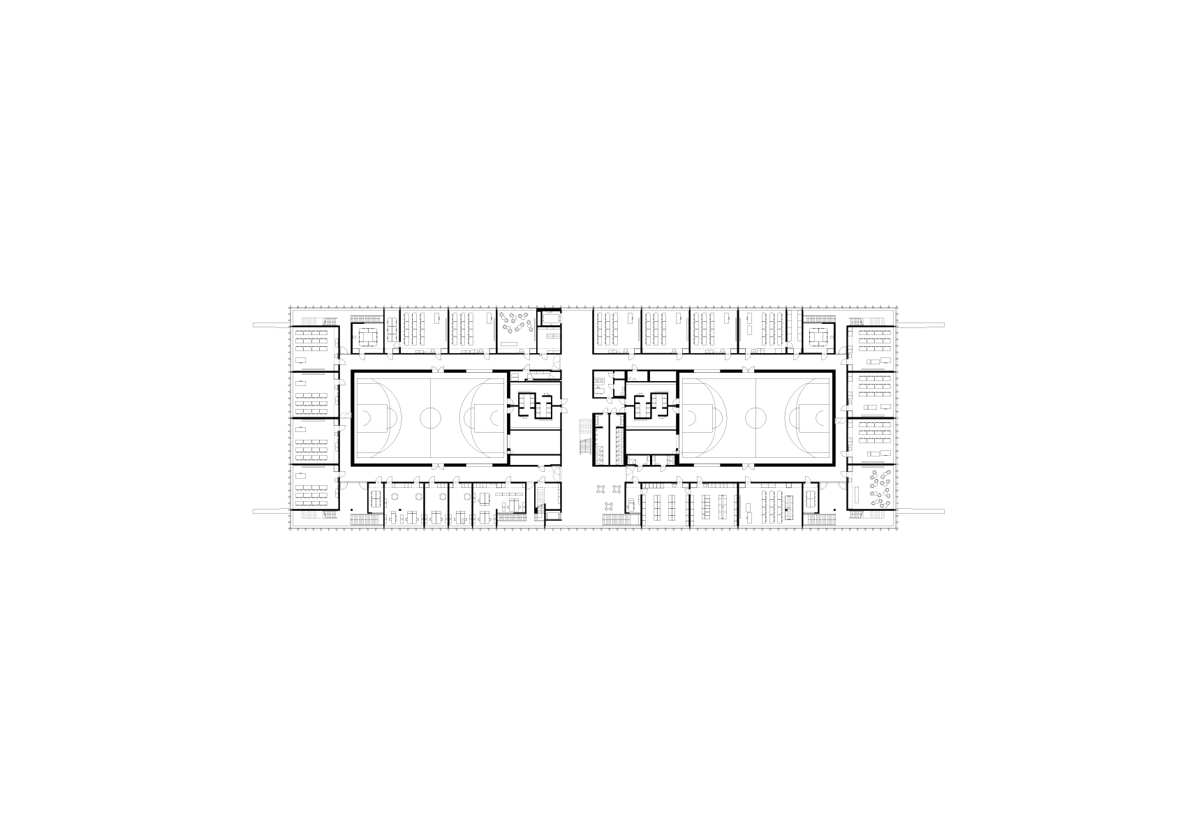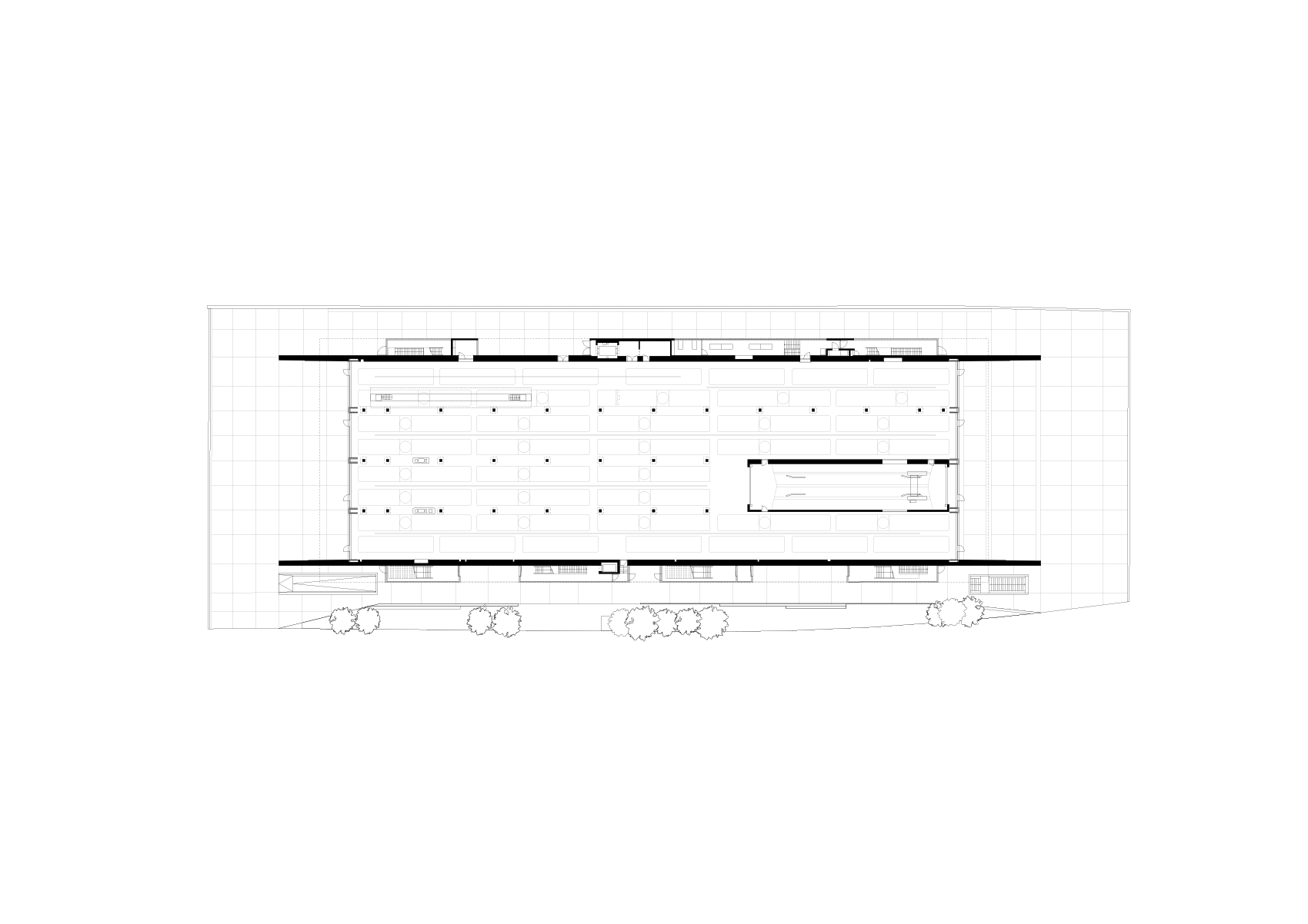 Die erste Entwurfsmassnahme war, dem Busdepot einen eigenen Ausdruck zu geben und es nicht im Untergeschoss zu versenken. Die ebenerdige Lage ermöglicht einfache und übersichtliche Bewegungen, kurze Wege, einen Aufenthaltsbereich für das Personal am Licht, ein optimiertes Gebäudevolumen und damit geringere Kosten. Die zentrale Lage des Busdepots verlegt die Erschliessungen an die Peripherie und gibt, zusammmen mit der beträchtichen Breite, das Layout der darüber liegenden Schule vor. Die Mitte der Schulanlage wird mit von oben belichteten Turnhallen genutzt, die peripheren Erschliessungen führen die Nutzer zum Licht und machen in den Pausen den Schulbetrieb sichtbar.