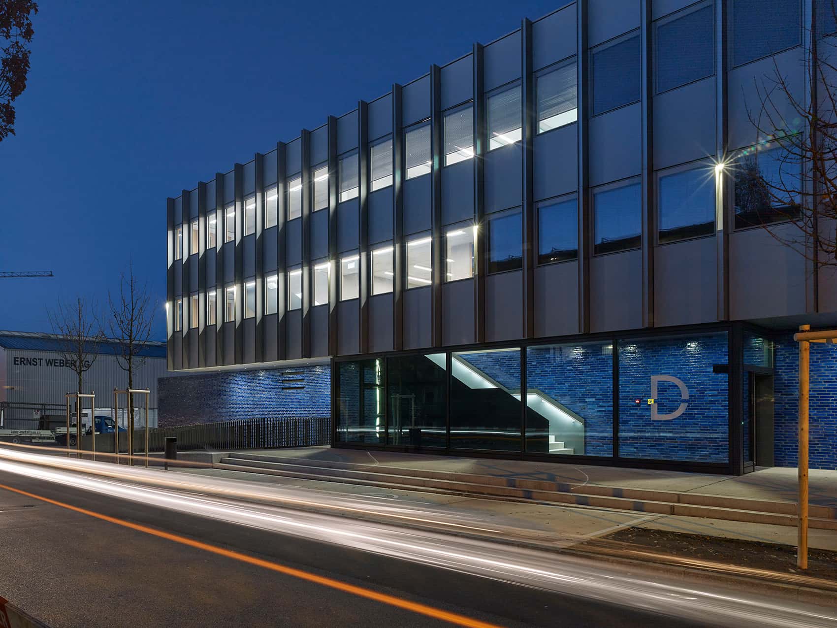 Das Haus erscheint trotz seiner Grösse leicht und dynamisch. Seine Farbigkeit wechselt je nach Licht und Tageszeit, je nach Betrachtungswinkel wirkt es offen oder geschlossen. Die Umgebungsgestaltung verweist mit den Vorbereichen aus Beton auf die Funktion als Busdepot. Im Übergang zur Schellerstrasse entstehen aus dem gleichen Material Stufen und Sitzgelegenheiten für den Aufenthaltsbereich der Schule. Bäume markieren den Zugangsbereich zur Schule.
