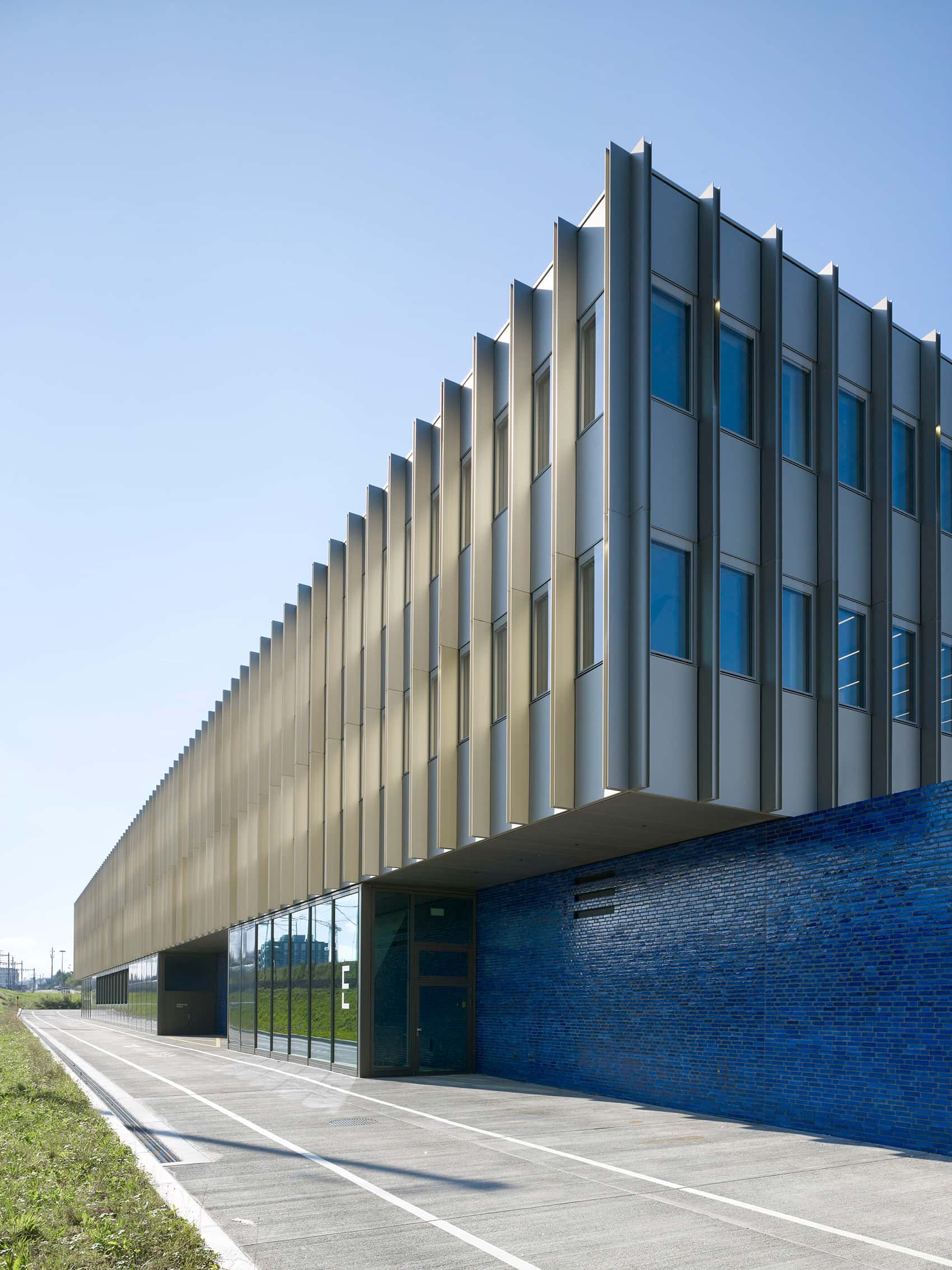 Im Inneren machen die Betonoberflächen die Konstruktion und Kräfte sichtbar, Holztüren, Holzbrüstungen und Holzverkleidungen setzten, zusammen mit den Lichtführungen, warme Akzente. Die blau glasierten Klinker, traditionelles Handwerk und Hightech zugleich verweisen auf den Betrieb der VZO.